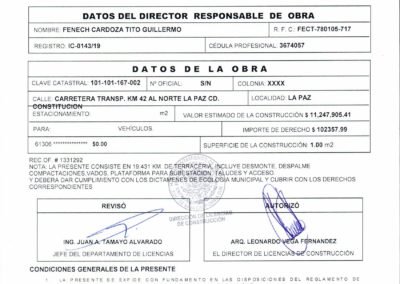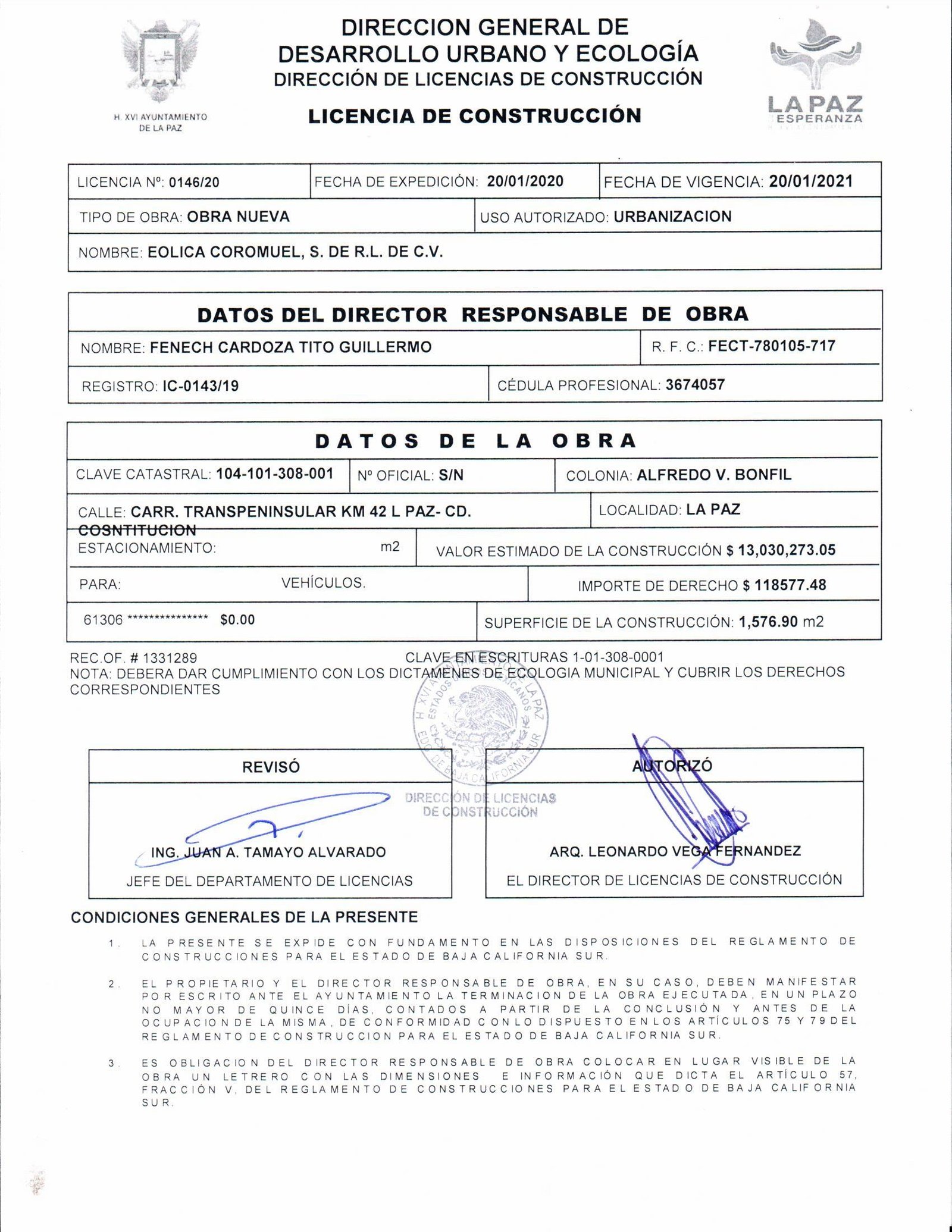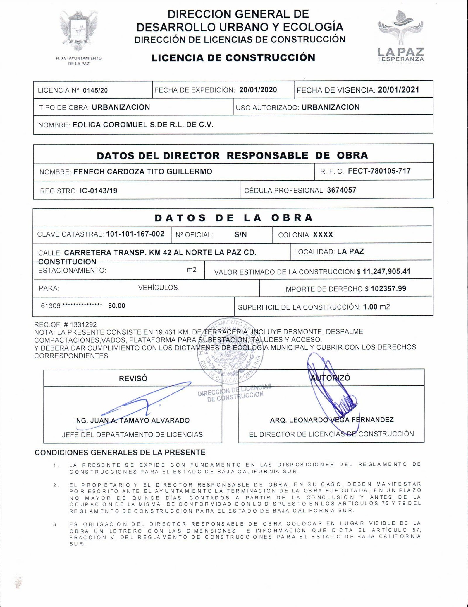 El día de hoy inician los trabajos de construcción de Parque de Energía Eólica, llamado Central Eólica Coromuel, consistente en veinte torres generadoras de energía, dos subestaciones líneas colectoras 34.5 kv (aéreas y subterráneas), plataformas y caminos internos y de acceso, ubicado en Ejido Alfredo V. Bonfil, Municipio de La Paz, B. C. S. y se apertura bitácora de obra bajo el amparo de las licencias de construcción 0145/20 y 0146/20 expedidas por la Dirección de Licencias de Construcción Municipales consistentes en terracería para caminos y plataformas.