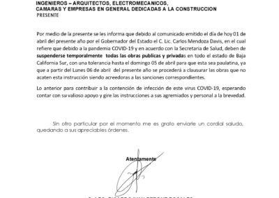 Dando cumplimiento al oficio DGDUYE-1101/172/20 emitido por la Dirección General de Desarrollo Urbano y Ecología del Ayuntamiento de La Paz, con fecha de 01 de abril de 2020, donde con base en el “Acuerdo por el que se da a conocer la Declaratoria de Emergencia Sanitaria por causa de fuerza mayor del Comité de Seguridad en Salud del Estado de Baja California Sur, en concordancia con la Emergencia Sanitaria declarada por el Consejo de Salubridad General, para controlar, mitigar y evitar la propagación del COVID-19” publicado en el Boletín Oficial del Gobierno del Estado de Baja California Sur el 31 de marzo de 2020, con esta fecha se suspenden temporalmente todos los trabajos en esta obra. La suspensión de los trabajos se hará efectiva el día de hoy al término de la jornada laboral y se mantendrá vigente hasta que la autoridad competente emita declaratoria de finalización de suspensión de trabajos en las obras de construcción. Para tal efecto se designa al contratista Elecnor como encargado de la vigilancia y resguardo del sitio de los trabajos así como bodegas, materiales, herramientas y demás utilitarios de la obra.
